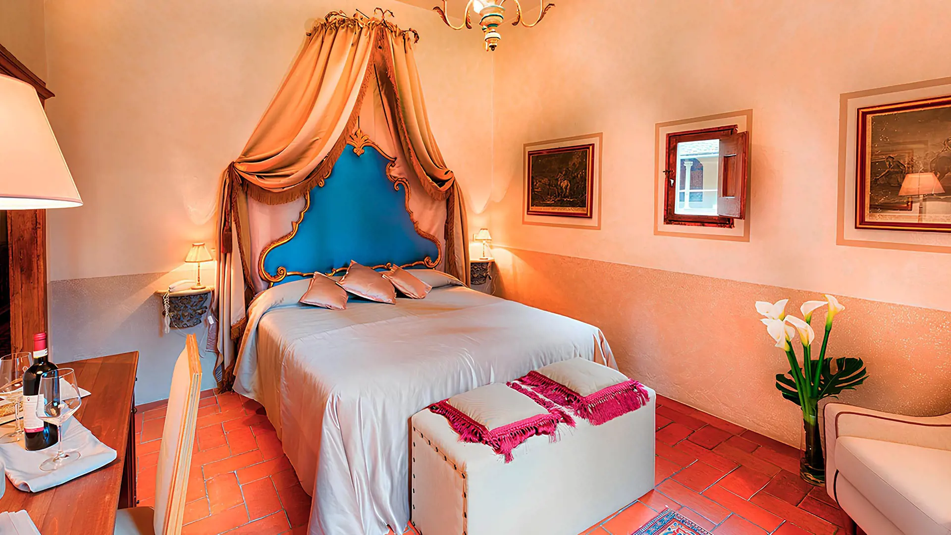 Spazi proporzionati e dettagli preziosi definiscono la Deluxe Sophia, un ambiente confortevole dallo stile ricercato. Il blu della testiera risalta sui colori caldi della camera, mentre dalle finestre entrano le sfumature verdi del giardino all’italiana, apprezzabili anche dal terrazzo condiviso. Il bagno, luminoso e funzionale, è dotato di una doccia comoda e rifinito con tonalità chiare.