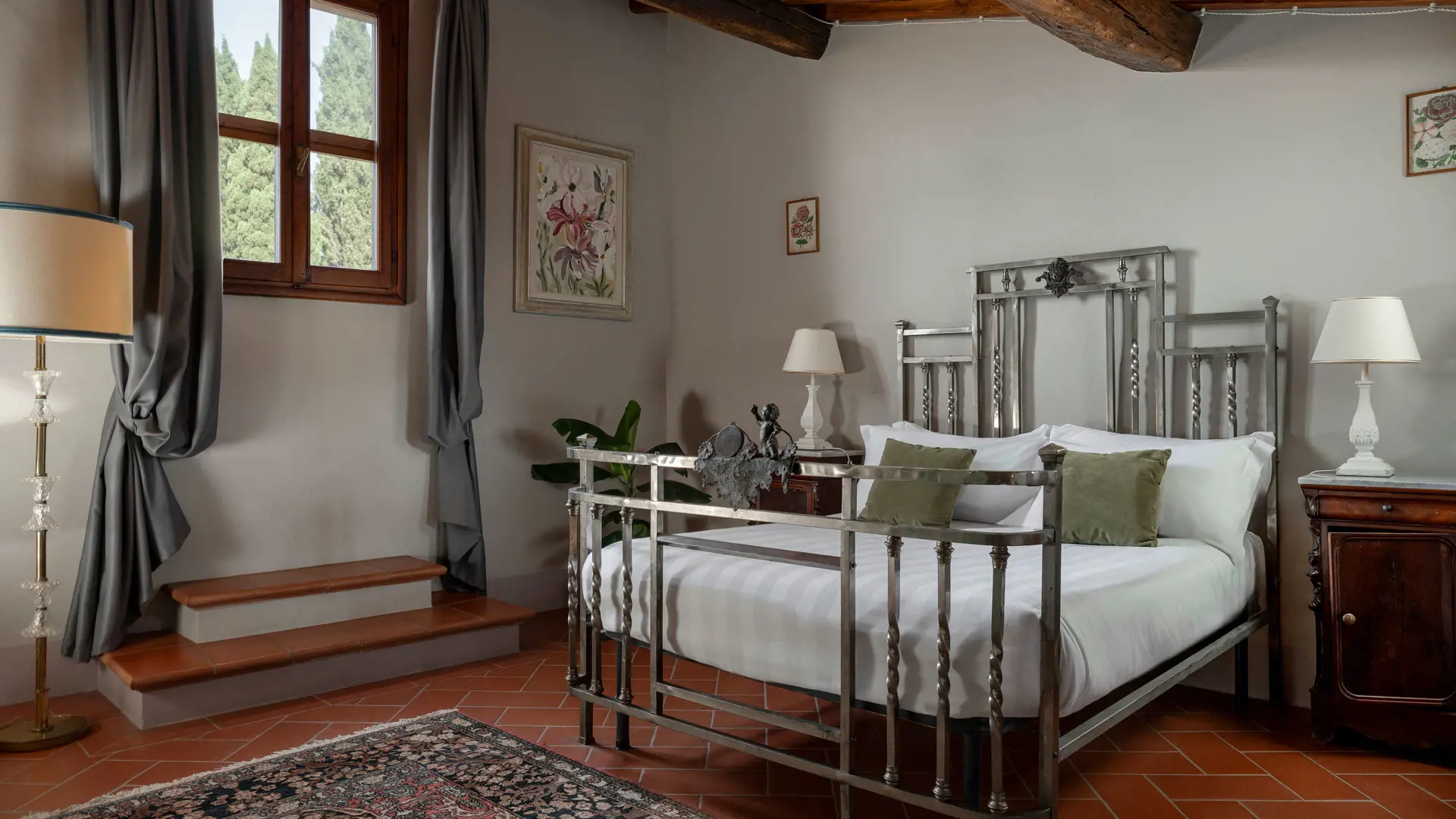 Dalle finestre si aprono scorci diversi come il giardino all’italiana, i cortili interni e altri angoli esterni della proprietà che accompagnano la giornata come dipinti che variano con la luce.