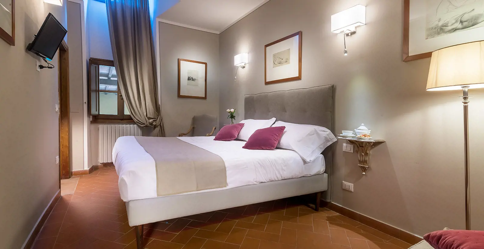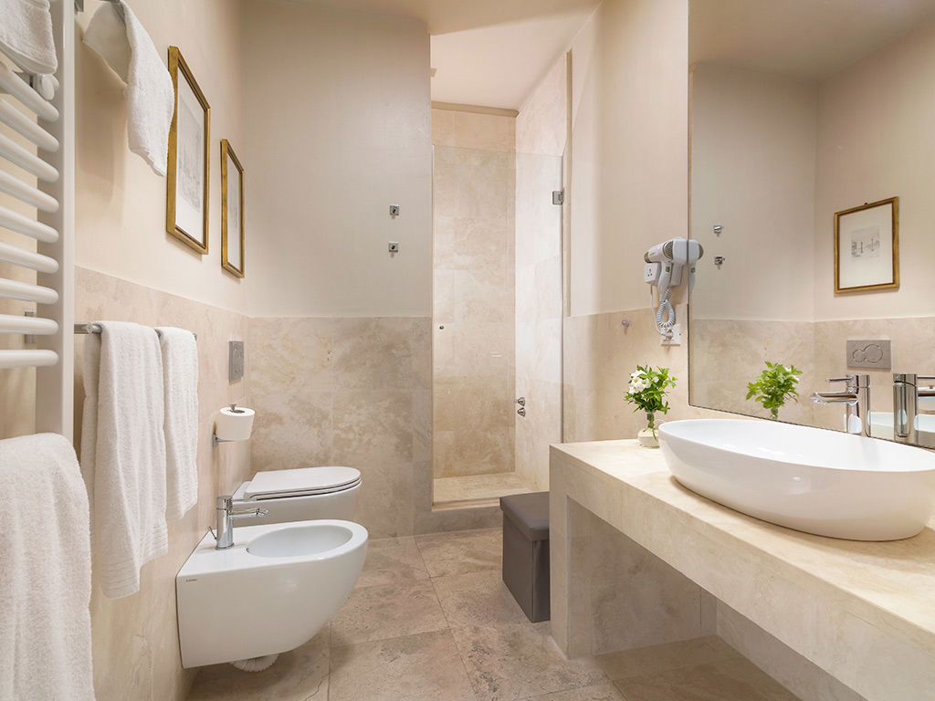 Situata nell’ala storica della villa, la Junior Suite Ortensia si caratterizza per spazi ben definiti e confortevoli. La camera dispone di un comodo letto matrimoniale, mentre la zona giorno ospita un divano letto matrimoniale. Le tonalità chiare e gli arredi eleganti valorizzano l’ampiezza della stanza. Il bagno, rifinito in pietra chiara, è luminoso e dotato di un’ampia doccia.