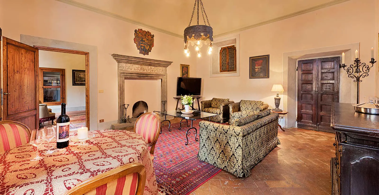 Nel salotto, il grande camino sormontato dallo stemma storico diventa un punto di riferimento silenzioso, mentre il tavolo invita a fermarsi, magari con un calice di vino o con un libro aperto a metà. Dalla sala si raggiunge l’ampia camera da letto, con un elegante baldacchino e una cabina armadio: un passaggio verso una dimensione più intima, dove tutto sembra trovare un ritmo più lento.