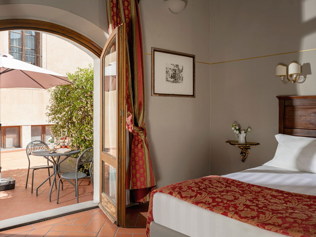 Terracotta floors, exposed wooden beams and handcrafted furnishings define the rooms and suites at Villa Casagrande, where every detail honours the authenticity of Tuscan heritage. Several accommodations overlook evocative historic settings, such as the ancient cloister or the formal Italian garden, while others are situated in the more recent wing, where stone and pale marble are paired in an elegant, understated contemporary style.